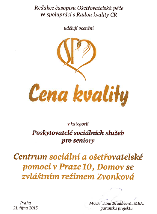 Cena kvality je každoročně udělována v několika kategoriích, mj. pobytová sociální zařízení pro seniory, terénní služby, domovy pro zdravotně postižené nebo osoby ohrožené sociálním vyloučením. Do jubilejního 10. ročníku prestižní soutěže vyhlašované redakcí časopisu Odborná péče ve spolupráci s Radou kvality ČR přišlo letos rekordních 108 nominací, z nichž bylo vybráno pro další hodnocení celkem 96 organizací. Domov se zvláštním režimem Zvonková, který je součástí Centra sociální a ošetřovatelské pomoci v Praze 10, zvítězil v kategorii Pobytová zařízení pro seniory. Slavnostní udílení cen proběhlo ve středu 21. října 2015 v Rytířském sále Senátu Parlamentu ČR. Cena kvality je stejně jako předchozí ocenění, certifikát Vážka, pro DZR Zvonková nejen motivující, ale zároveň i zavazující. Aby si udržel získanou prestiž mezi poskytovateli sociálních služeb i veřejností, bude se domov snažit ještě více rozšířit a zkvalitnit poskytované služby.